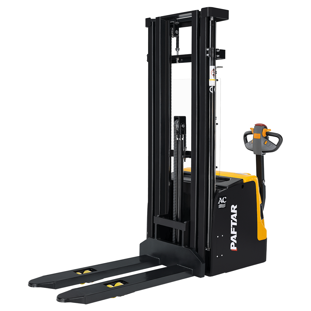 Paftar ES1546ZF yaya kumandalı istif makinesi, 1.5 ton taşıma kapasitesi ve 4600 mm kaldırma yüksekliği ile AC yürüme motoru ve 1600mm Freelift kaldırma sistemi sayesinde çok yüksek raflara güvenli ve verimli erişim sağlar.